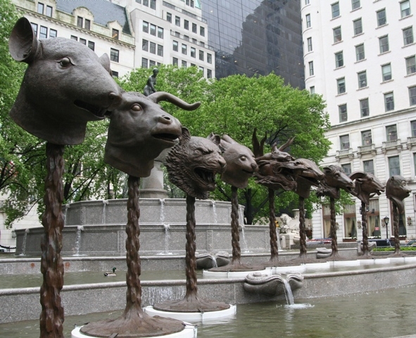 Ahora, exploremos el reino animal con «Círculo de Animales/Cabezas del Zodiaco.» Esta serie de doce cabezas de animales de bronce, completada en 2010, reimagina el tradicional zodiaco chino. Estas esculturas caprichosas, cada una con su personalidad distintiva, han aparecido en varias ubicaciones en todo el mundo. Es como un juego global de escondite con el arte, generando conversaciones sobre la identidad cultural, el desplazamiento y el lenguaje universal de la creatividad.