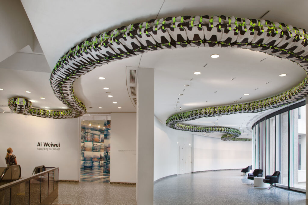 “Techo de Serpiente” se desliza en nuestros corazones con su poderoso simbolismo. Elaborada en 2009, esta instalación presenta cientos de mochilas suspendidas del techo, formando la forma de un dragón serpenteante. Es un conmovedor homenaje a los niños escolares que perdieron la vida en el terremoto de Sichuan en 2008. Ai Weiwei transforma la tragedia en arte, creando una narrativa visual que se eleva con resiliencia y recuerdo.